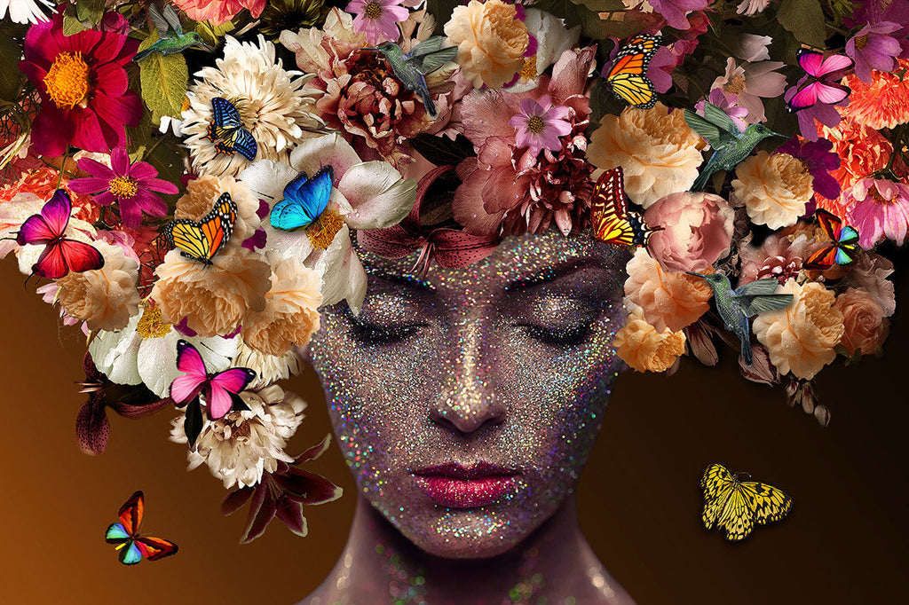 Schilderij 120x80 Dame met bloemen en glitters (Glas)