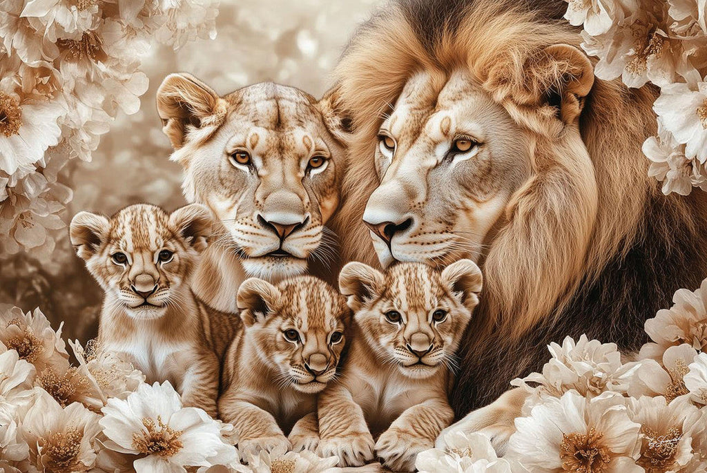 Schilderij 120x80 Getekende leeuwen 3 welpjes (Glas)