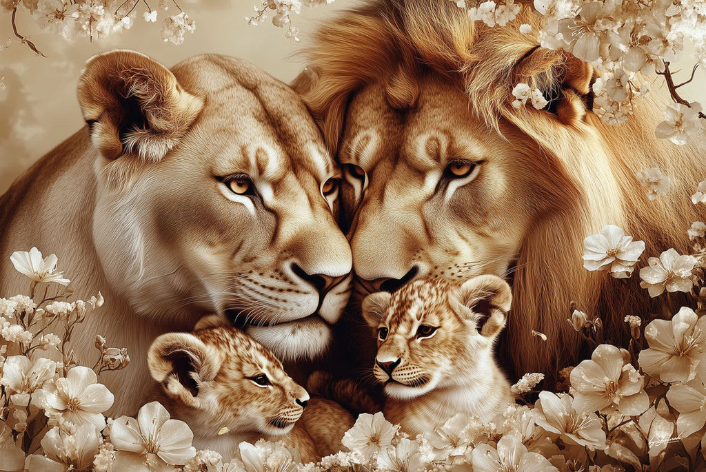 Schilderij 120x80 Getekende leeuwenfamilie (Glas)