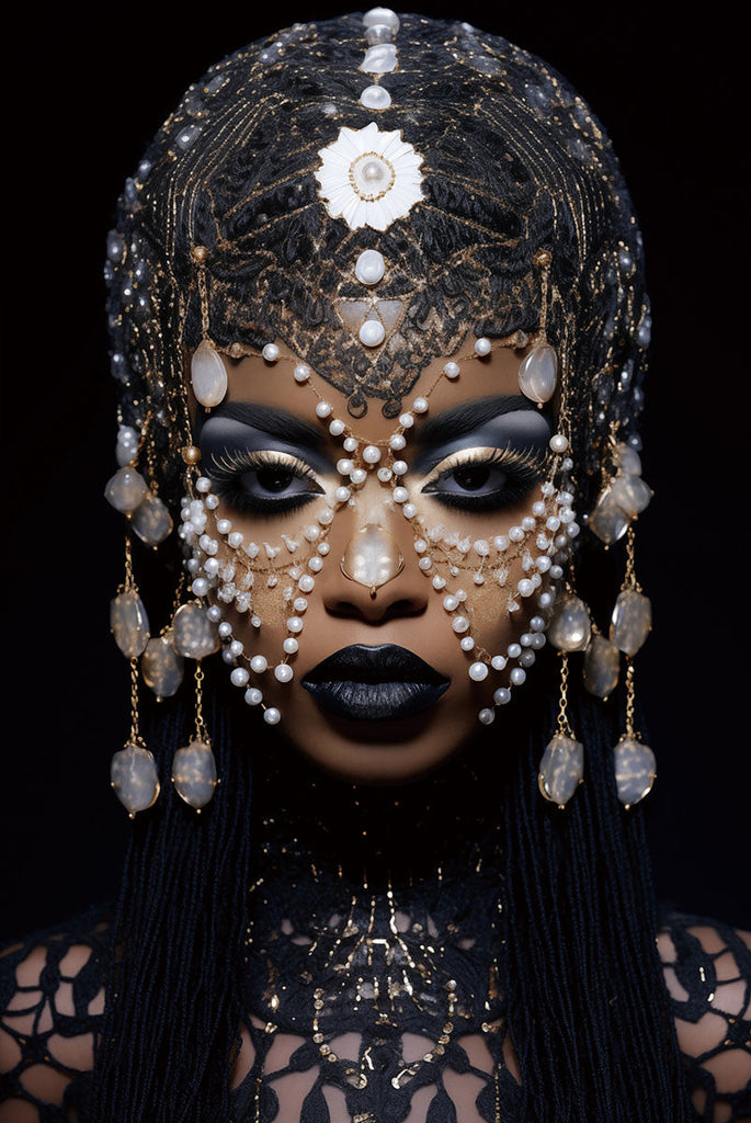 Schilderij 80x120 Vrouw met blauwe/witte sieraden (Glas)