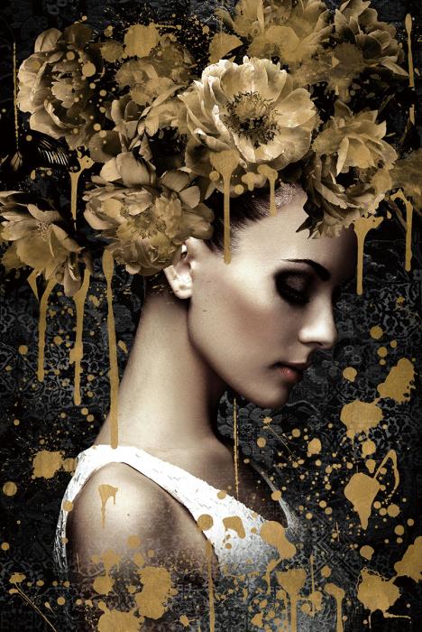 Schilderij 80x120 Vrouw met gouden bloemen (Glas)