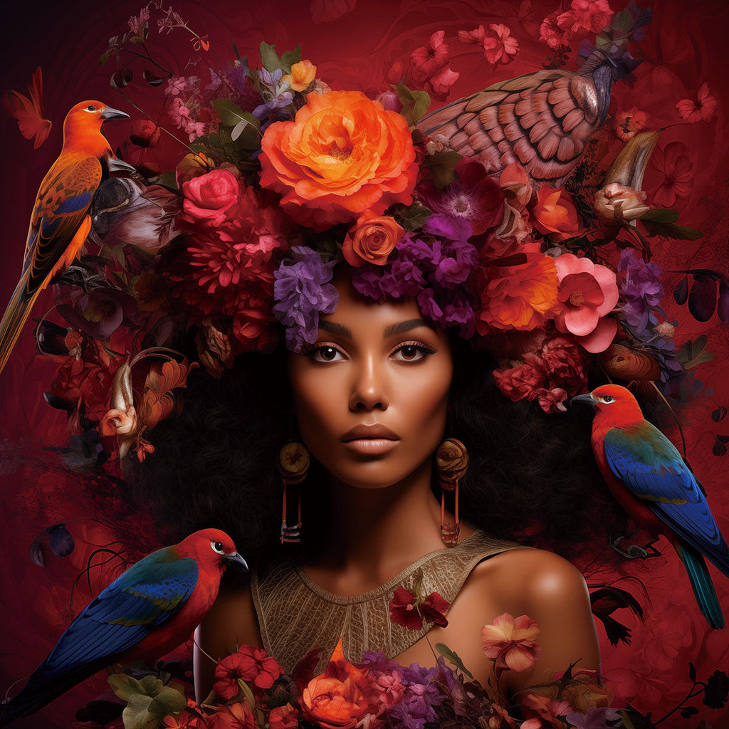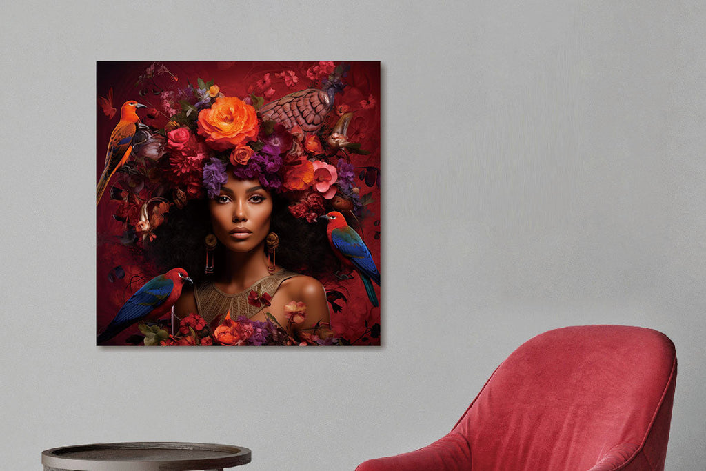 Schilderij 80x80 Vrouw met rode bloemen en vogels (Glas)